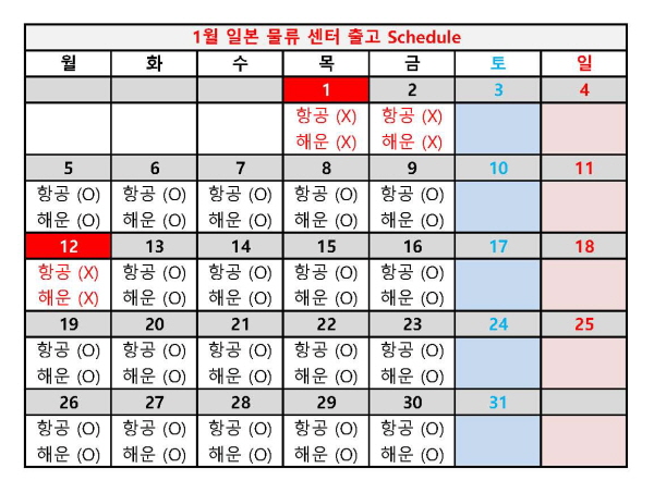 2026년 1월 출고 스케줄 및 한국/일본 휴무일 안내